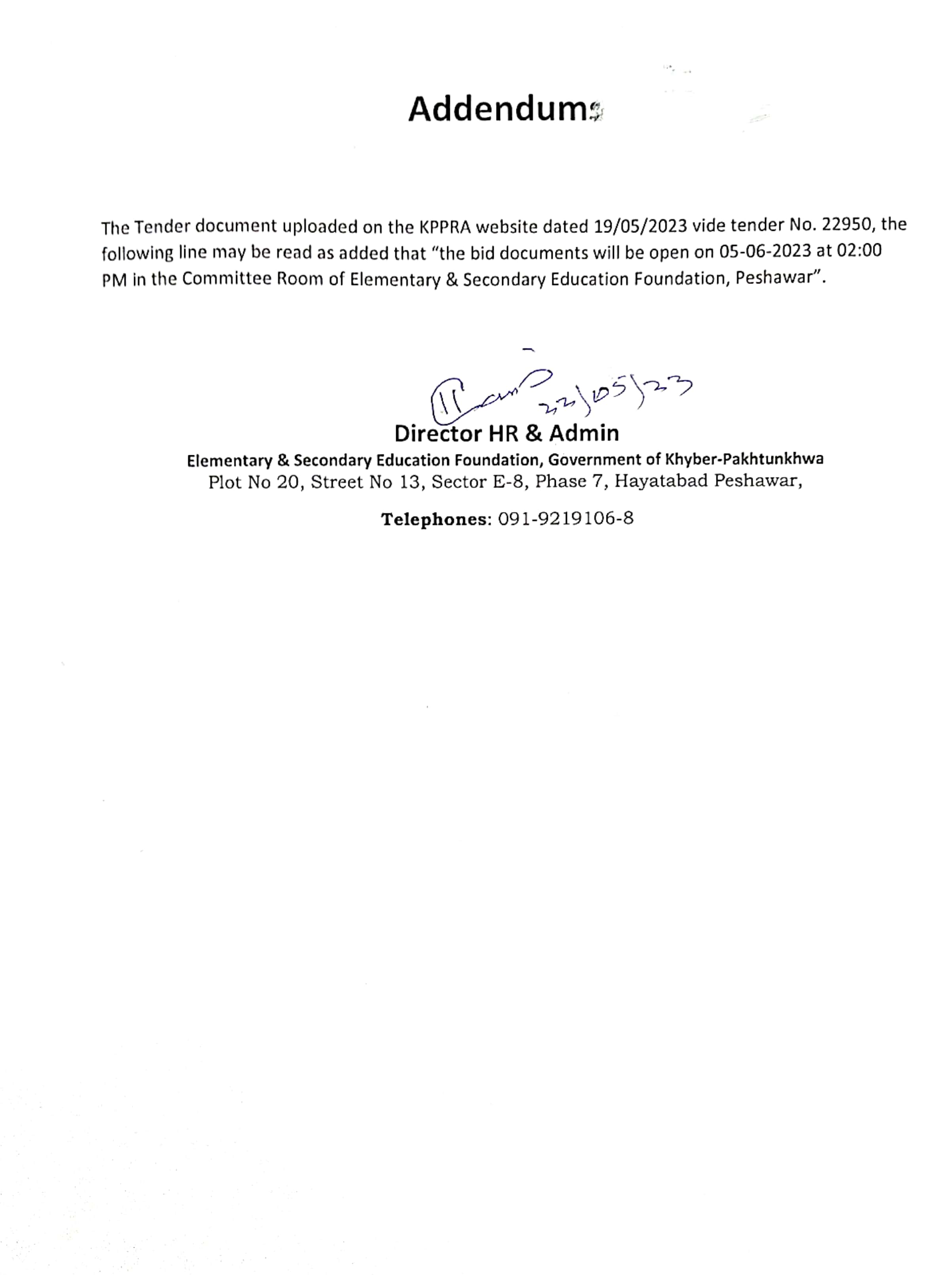 Addendum regarding Tender Document